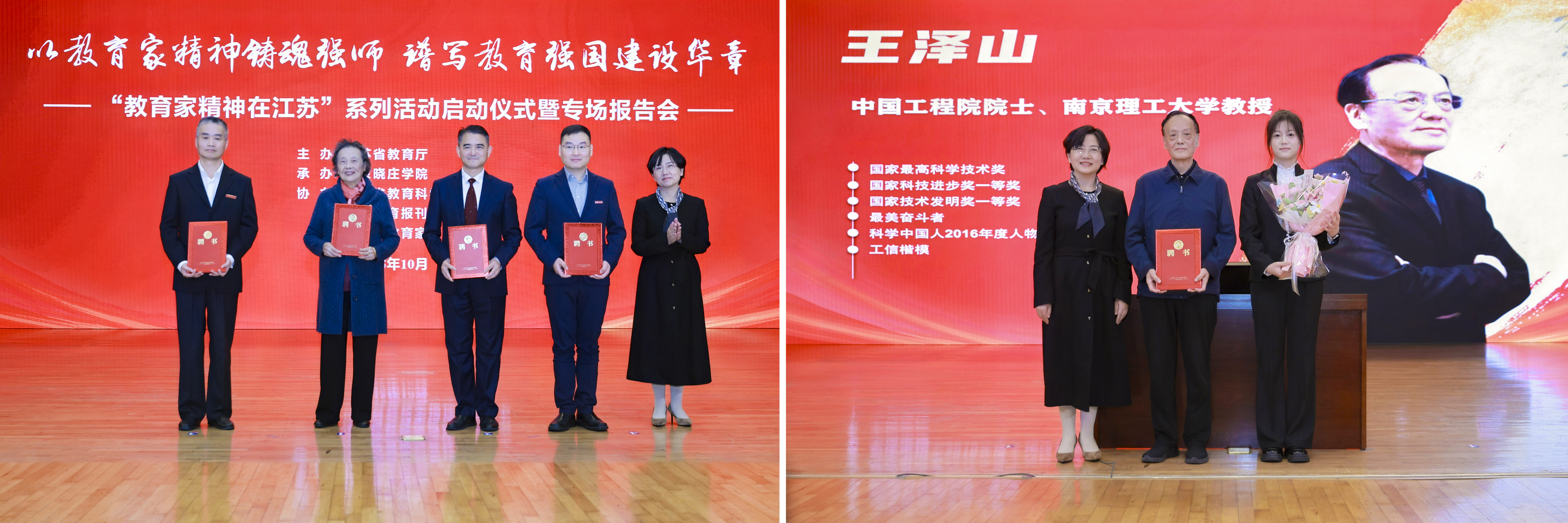 同台宣讲的还有中国工程院院士、国家最高科学技术奖获得者、最美奋斗者、南京理工大学王泽山院士,全国教书育人楷模、南通市启秀中学李庾南老师,全国教书育人楷模、教育部教育家精神宣讲团成员、中国教育学会副会长、南京市行知教育集团原总校长杨瑞清老师,全国最美教师、南京铁道职业技术学院薄宜勇教授。5位来自江苏的教育家代表结合自身教学、科研与实践经历分别作专场报告,生动诠释了教育家精神的时代内涵与鲜活力量。