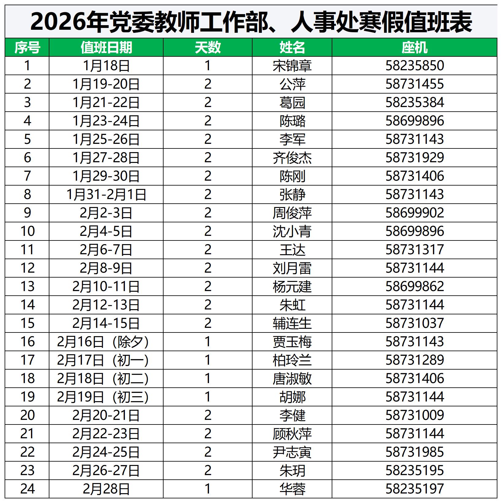为全面保障寒假更便捷地为广大教职工提供人事服务,根据学校《关于2026年寒假学校工作安排的通知》精神,结合我部门工作实际,党委教师工作部、人事处2026年寒假工作人员值班时间及地点具体安排如下: