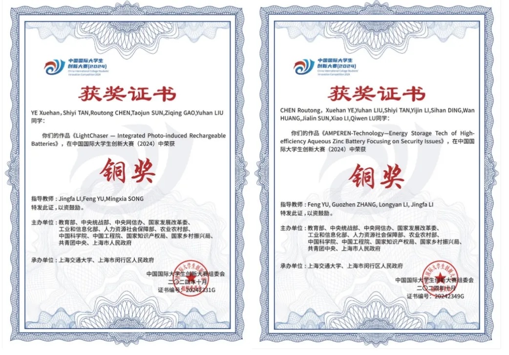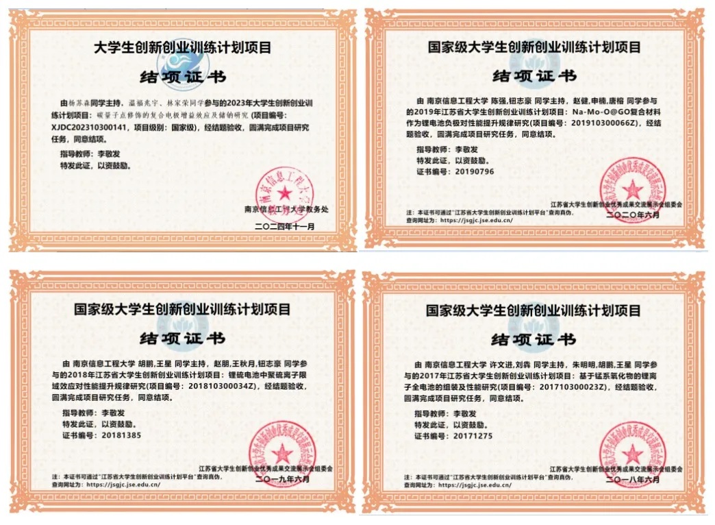 团队坚持教学科研创新,构建"基础理论-科研训练-产业实践"三位一体人才培养体系。指导学生积极参加 “互联网+”大学生创新创业大赛、全国大学生金相技能大赛、中国国际大学生创新大赛、全国大学生化工设计竞赛等各项比赛并获得国家级奖项10余项。指导的本科生10余人获得国家级大学生创新训练项目并顺利结题,研究生十余人次获得国家奖学金、优秀毕业生、校级优秀毕业论文等,连续6人次获得江苏省科研创新计划项目立项。