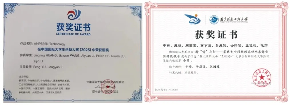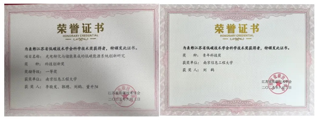 获评江苏省低碳技术学会科技创新一等奖、江苏省低碳技术学会青年科技奖