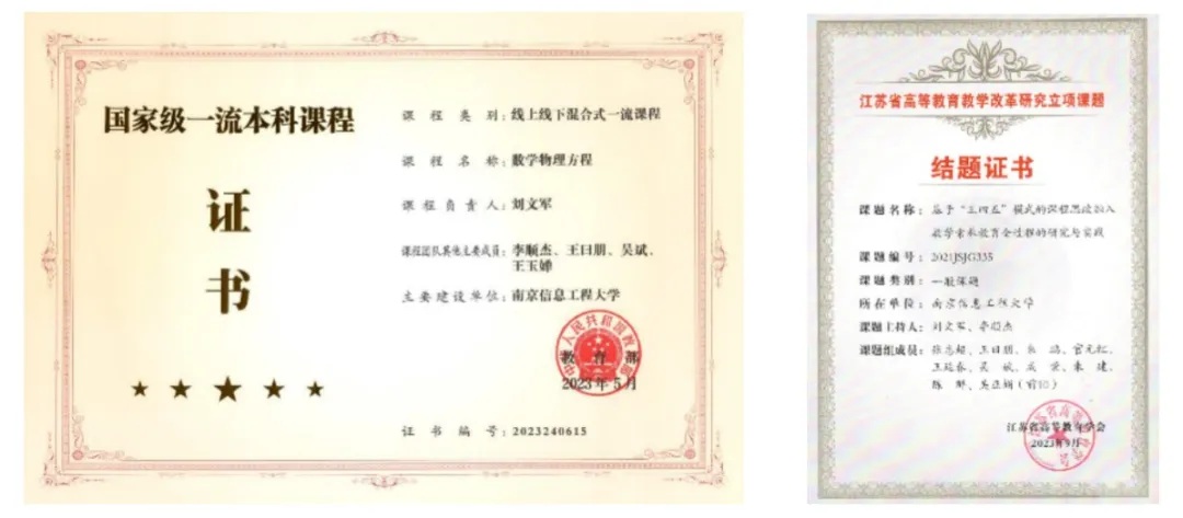 爱爱岗敬业,积极投身教学工作,承担多门本科课程的教学工作。其中,作为《数学物理方程》课程组核心成员,始终以提升教学质量为己任,借助慕课积极进行线上线下混合课程建设,获得显著成效,于2023年获批国家级一流本科课程(排名第二)。在教学实践中,持续推进教学改革研究,开展课程思政建设工作,加强专业教学与课程思政的科学融合。共同主持的“基于‘三四五’模式的课程思政融入数学素养全过程的研究与实践”获批江苏省高等教育教学改革研究课题并于2023年顺利结题。